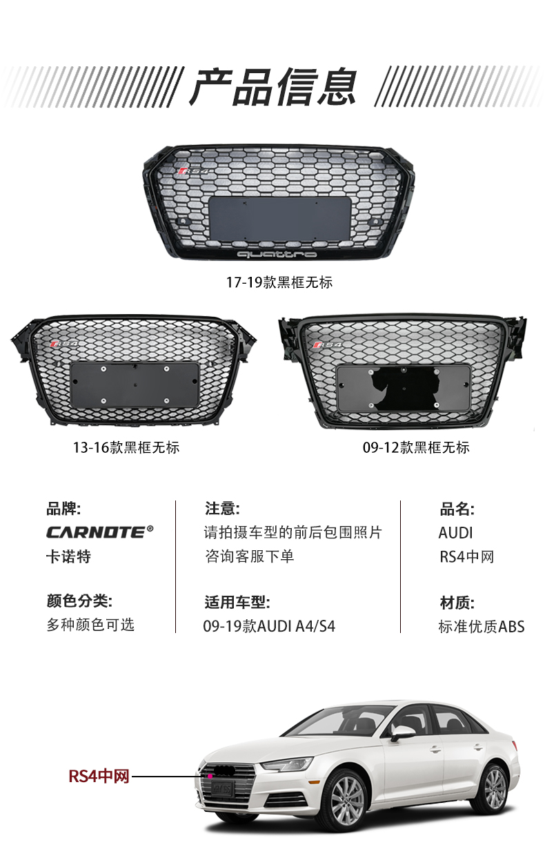 09-21新款A4L改装RS4中网配件装饰条蜂窝格栅前脸适用于奥迪A4L